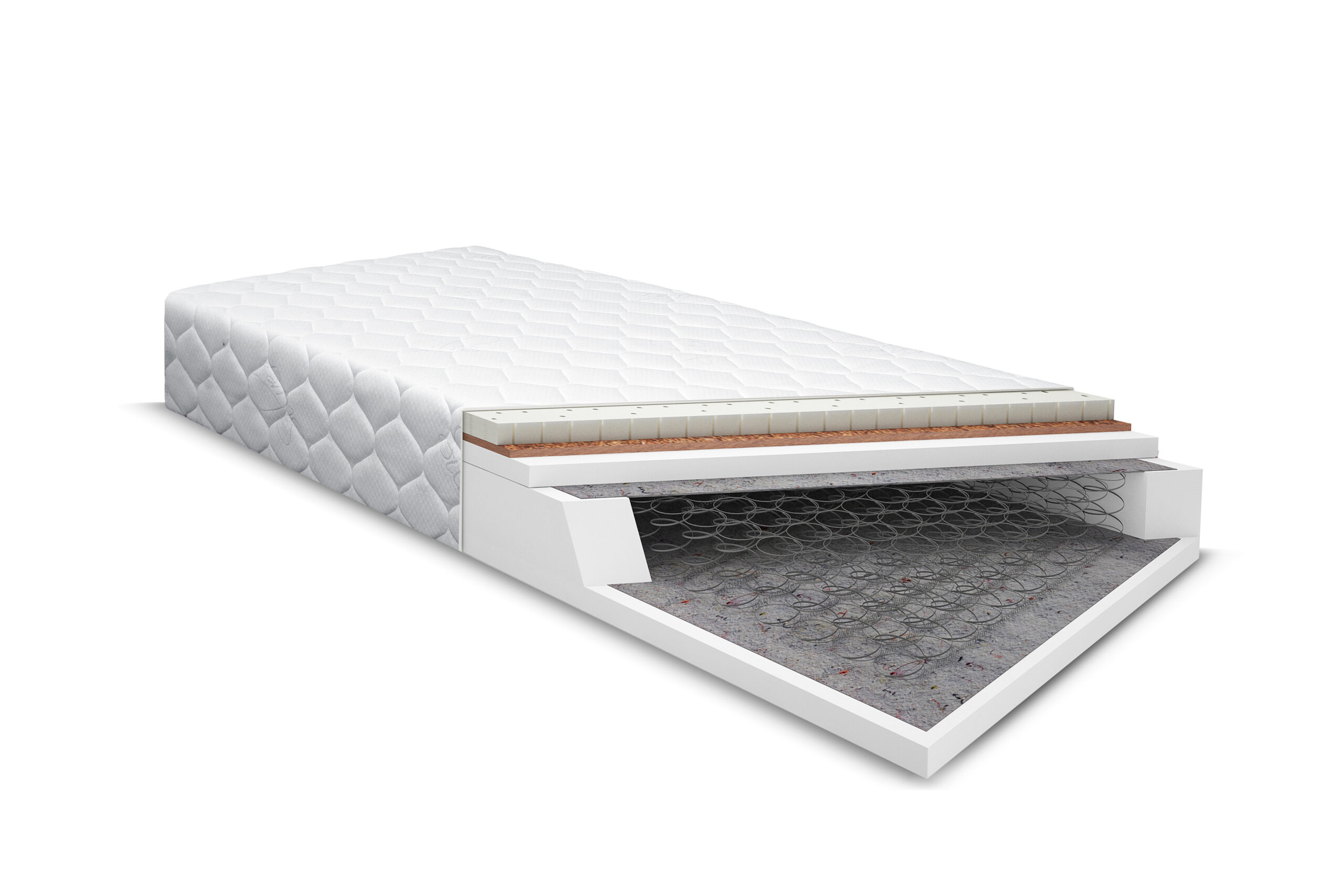 Materac BASILIO to dwustronny materac, wypełniony wysokiej jakości sprężynami bonellowymi, które zapewniają elastyczność powierzchniową. Zaletą wykorzystania sprężyn bonellowych jest ich wytrzymałość oraz funkcja równomiernego rozkładania nacisku na całą konstrukcję materaca, dzięki czemu użytkownik nie odczuwa tzw. „zapadania się”. Wypełnienie bonellowe jest otoczone pianką antyalergiczną posiadającą certyfikat OEKO-TEX oraz atest higieniczny, wspomaga ona właściwą wentylację materaca. Z obu stron materaca zastosowano naturalną przedkładkę w postaci filcu, która oddziela sprężyny od pianki. Filc wzmacnia konstrukcję materaca oraz przedłuża jego żywotność. Do wypełniania zastosowano matę z kokosa, jest to ekologiczny produkt pochodzenia naturalnego. Mata poprawia cyrkulację powietrza wewnątrz materaca, wchłania wilgoć oraz odprowadza ją na zewnątrz. Surowiec ten jest antyalergiczny i nie powoduje uczuleń. W materacu wykorzystano również płytę pianki lateksowej, która charakteryzuje się wysoką odpornością na odkształcenia oraz wyjątkową elastycznością