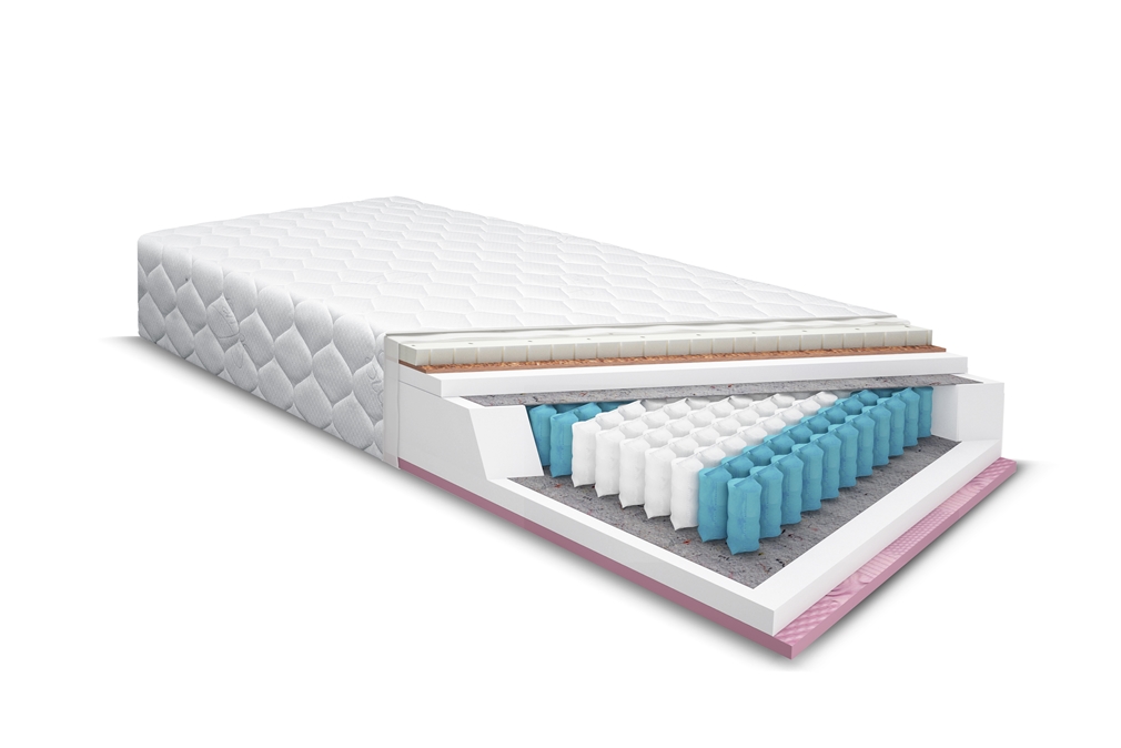 Materac GINO to dwustronny materac z systemem sprężyn kieszeniowych w ilości 270 szt na m2. Zastosowanie systemu kieszeniowego wpływa na właściwe podparcie układu szkieletowego podczas snu. Materace kieszeniowe doceniane są przez osoby borykające się z problemami kręgosłupa. By materac był jeszcze bardziej komfortowy, zastosowano system siedmiu stref twardości, który poprzez zróżnicowany stopień sprężystości doskonale podpiera poszczególne części ciała. Warstwa termo-elastyczna reaguje na nacisk oraz ciepło ciała, przez co idealnie dopasowuje się do kształtów użytkownika. Pianka VISCO zapobiega powstawaniu odleżyn, zapewnia równomierne ułożenie kręgosłupa oraz poprawę krążenia obwodowego podczas snu. Wypełnienie kieszeniowe jest otoczone pianką antyalergiczną posiadającą certyfikat OEKO-TEX oraz atest higieniczny. Wykorzystanie filcu zapewnia dłuższą żywotność materaca. Dodatkowo zastosowano matę kokosową, która poprawia cyrkulację powietrza, wchłania wilgoć oraz odprowadza ją na zewnątrz. W materacu wykorzystano piankę lateksową, która charakteryzuje się wysoką odpornością na odkształcenia oraz wyjątkową elastycznością.