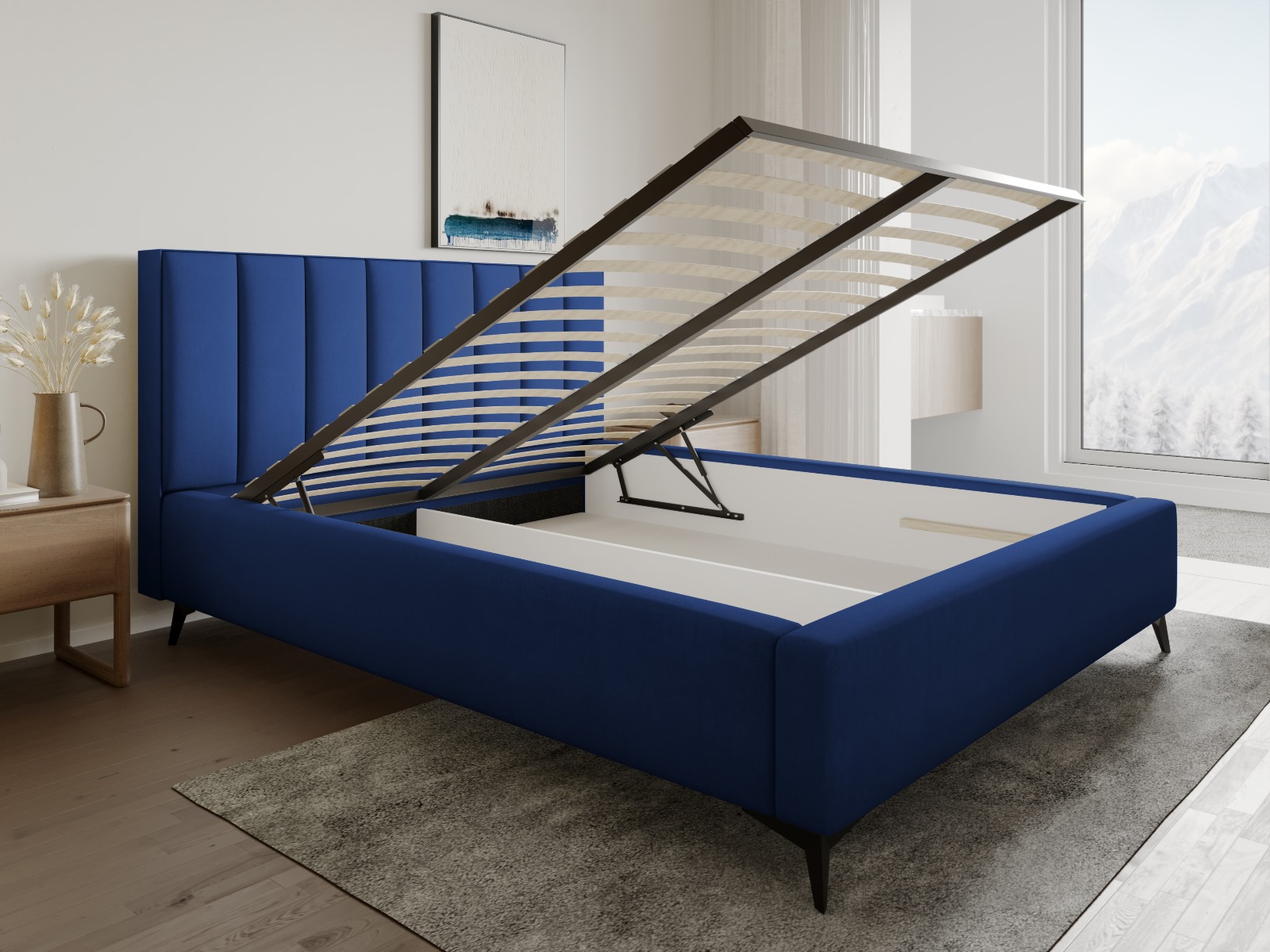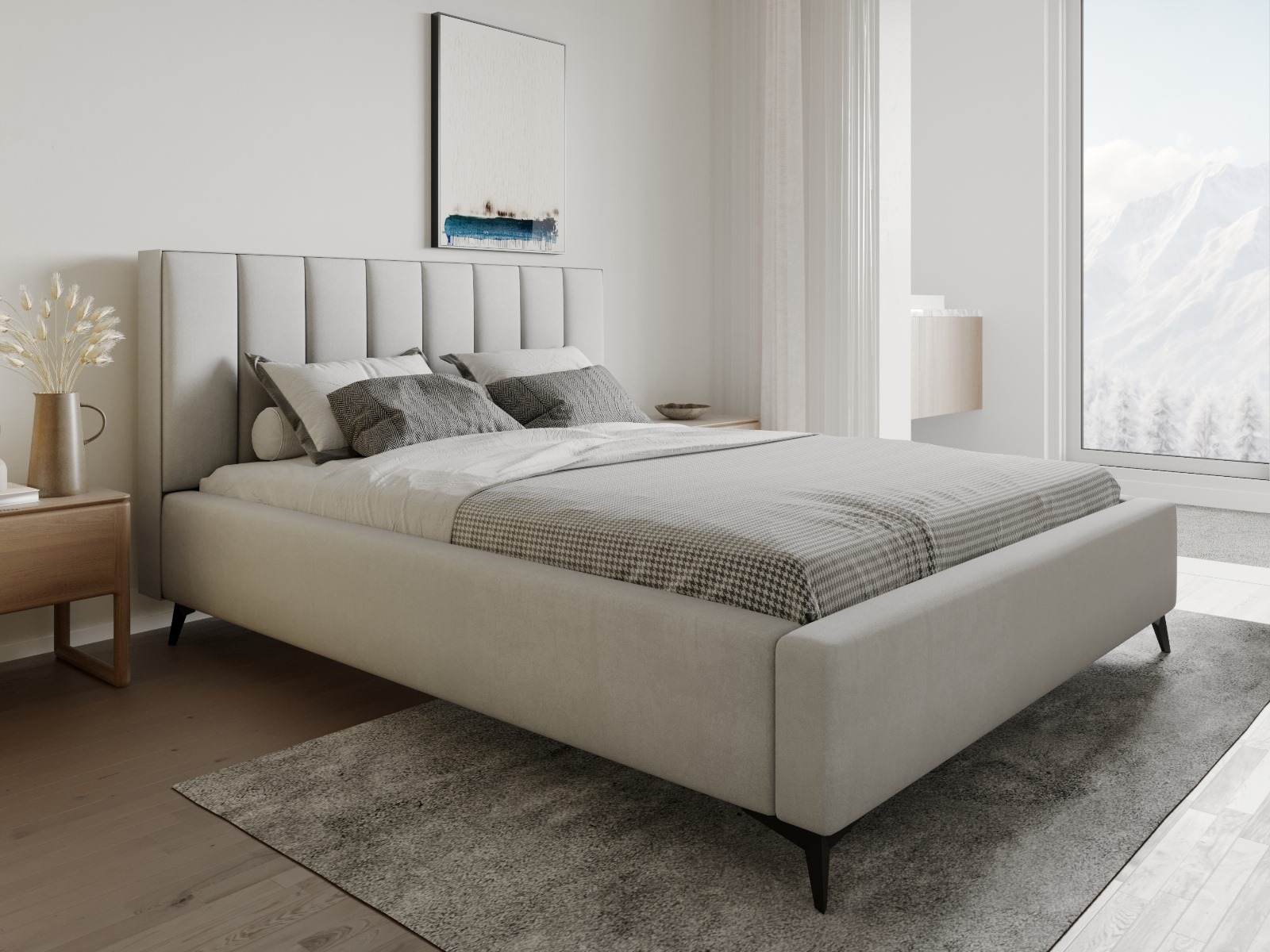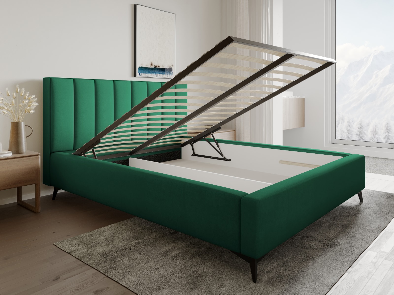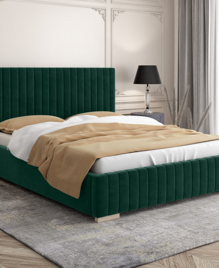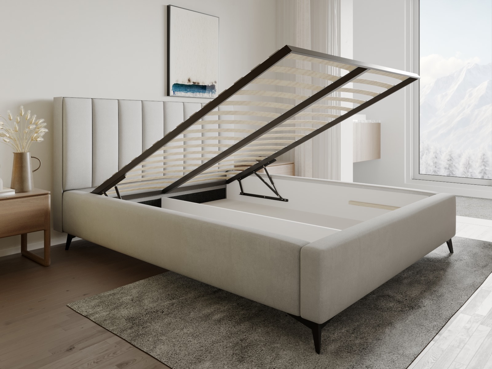 Łóżko Berlin idealnie nadaje się do każdej sypialni, dzięki bardzo wytrzymałemu stelażowi wraz z pojemnikiem na pościel łóżko jest bardzo funkcjonalne, dodatkowe metalowe nóżki dodają stabilizacji oraz pięknego wyglądu. Na aranżacji przedstawione jest łóżko na materac 160x200z metalowym stelażem z gazowym podnośnikiem, stelaż posiada 34 drewniane listwy po 17 na stronę, które są bardzo wytrzymałe dzięki czemu stelaż będzie nam służył długie lata, oraz bardzo przyjemny w dotyku i czyszczeniu materiał welurowy MAGIC VELVET.