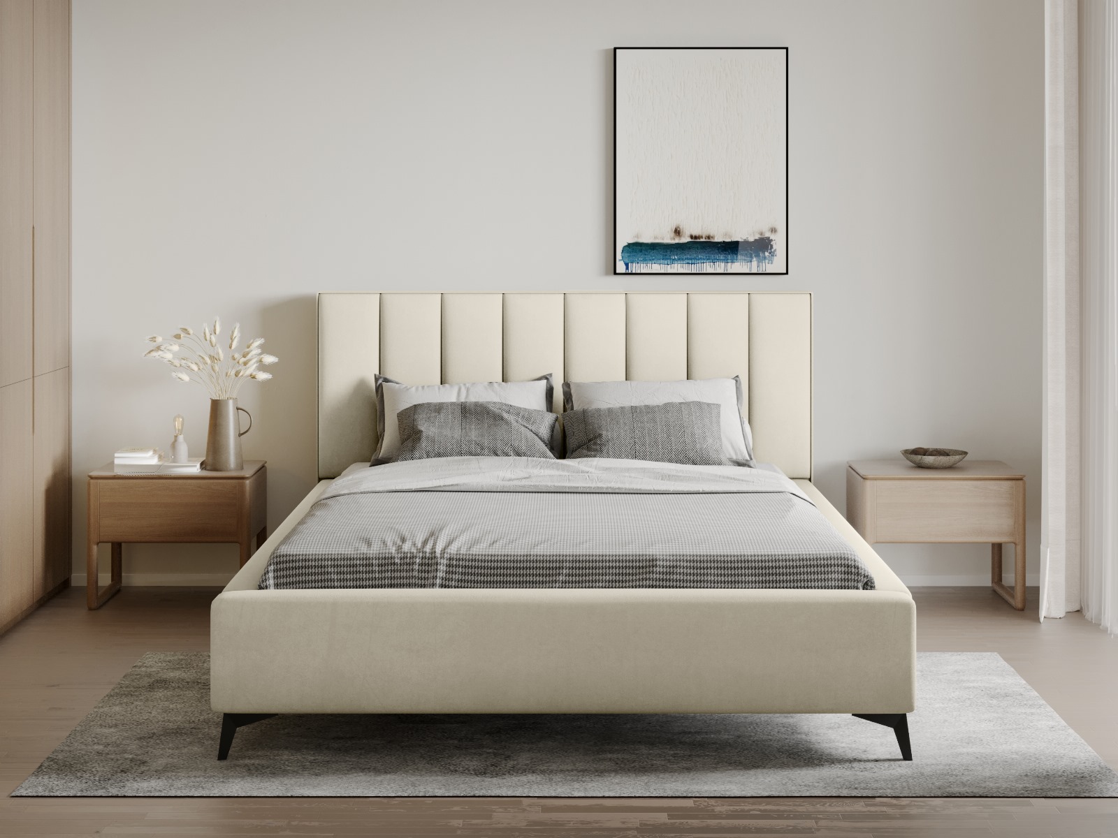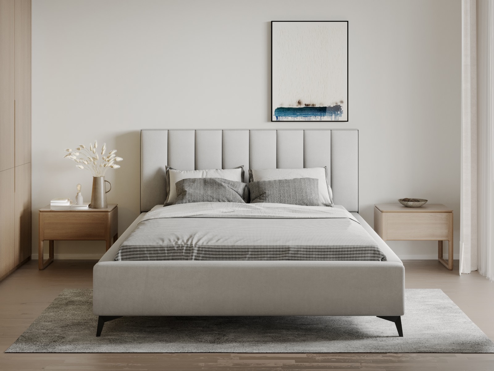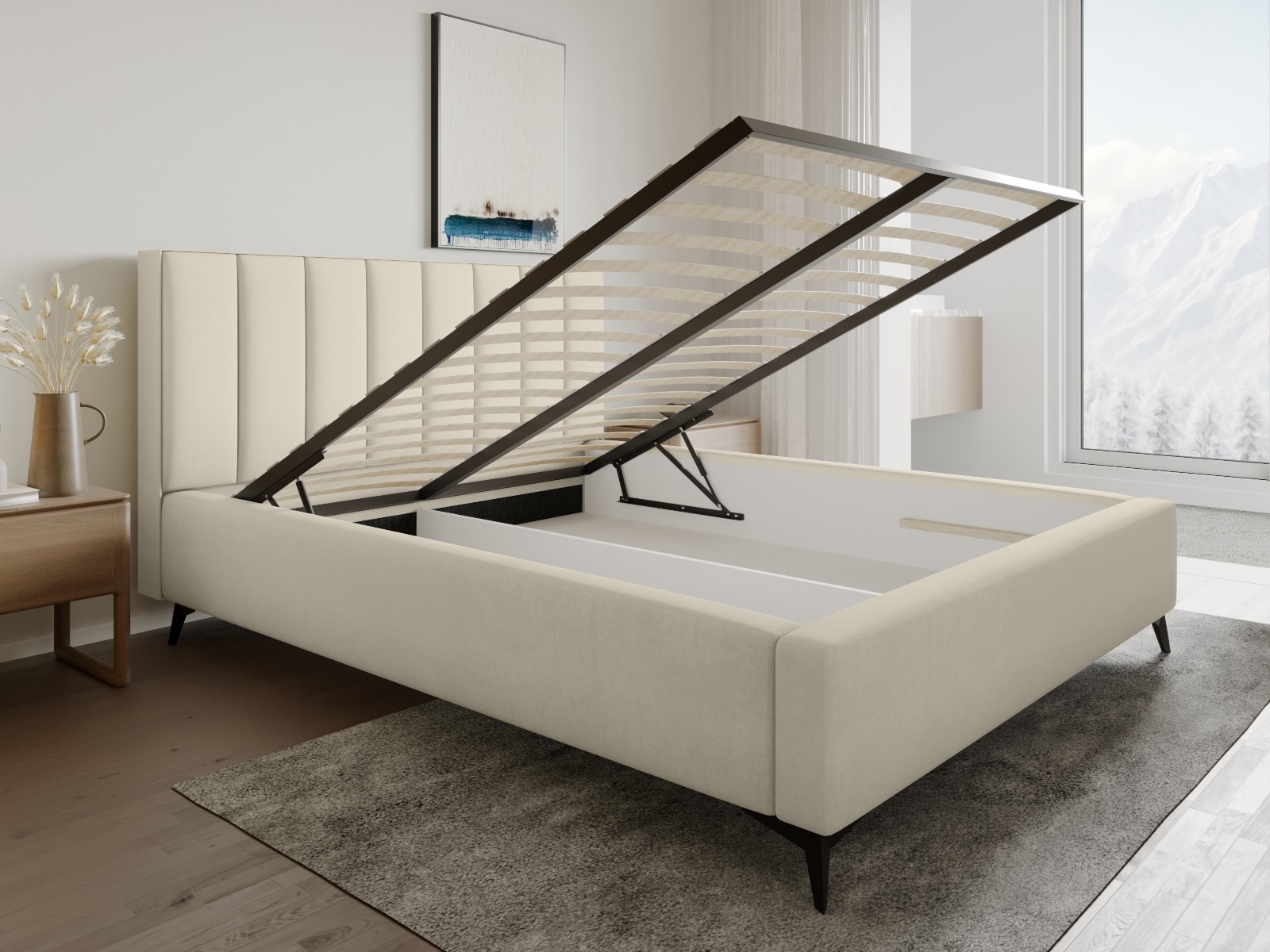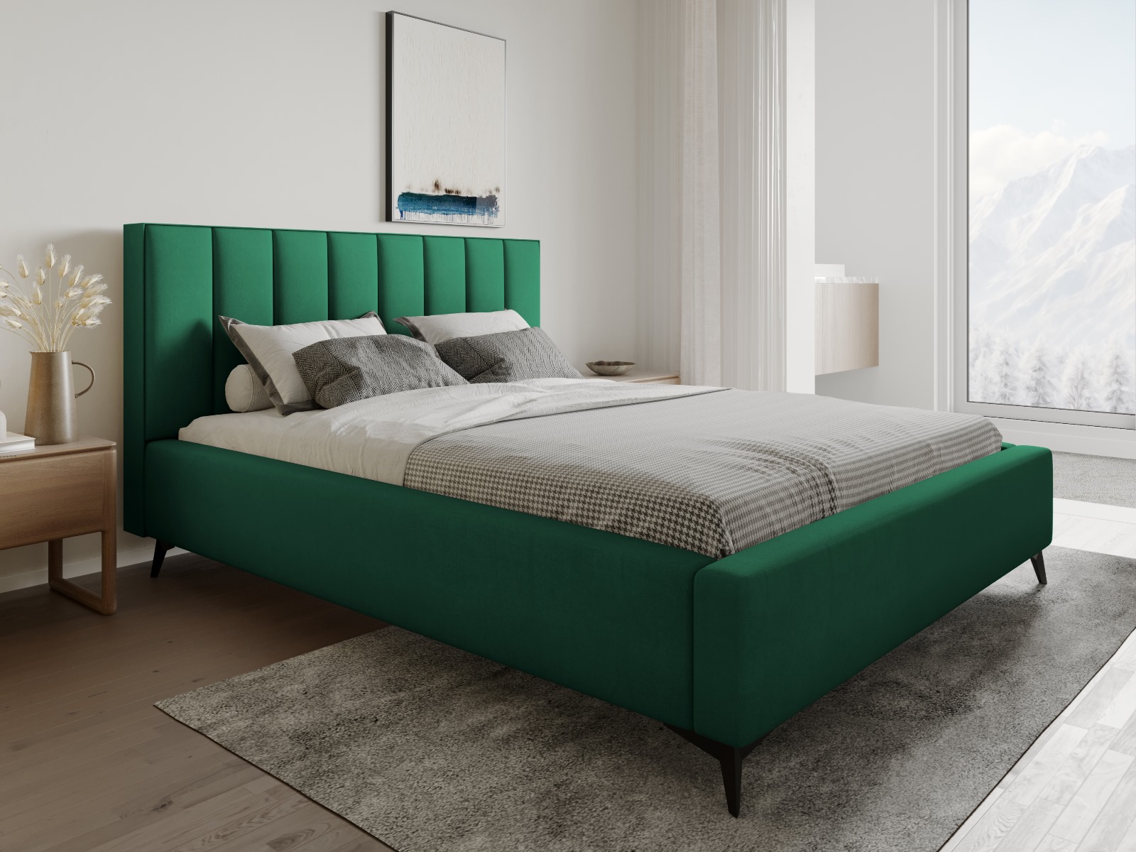 Łóżko Berlin idealnie nadaje się do każdej sypialni, dzięki bardzo wytrzymałemu stelażowi wraz z pojemnikiem na pościel łóżko jest bardzo funkcjonalne, dodatkowe metalowe nóżki dodają stabilizacji oraz pięknego wyglądu. Na aranżacji przedstawione jest łóżko na materac 160x200z metalowym stelażem z gazowym podnośnikiem, stelaż posiada 34 drewniane listwy po 17 na stronę, które są bardzo wytrzymałe dzięki czemu stelaż będzie nam służył długie lata, oraz bardzo przyjemny w dotyku i czyszczeniu materiał welurowy MAGIC VELVET.