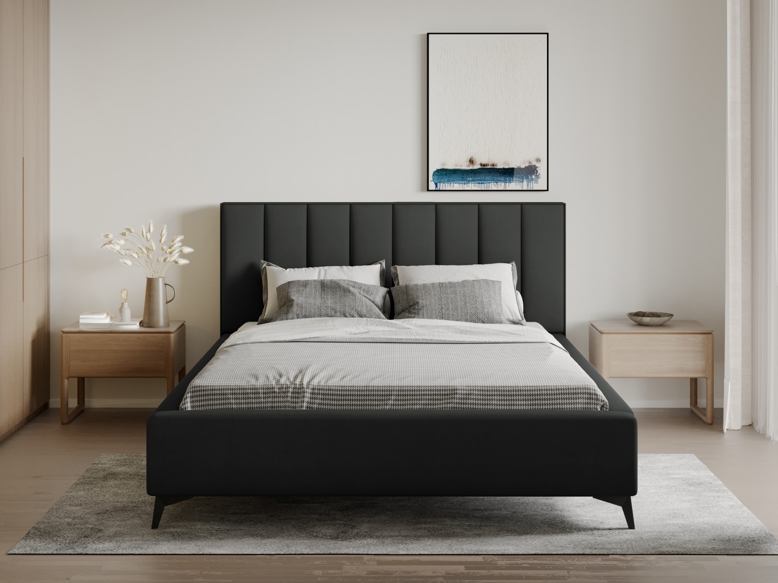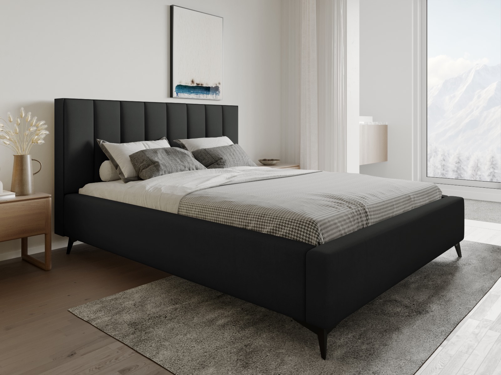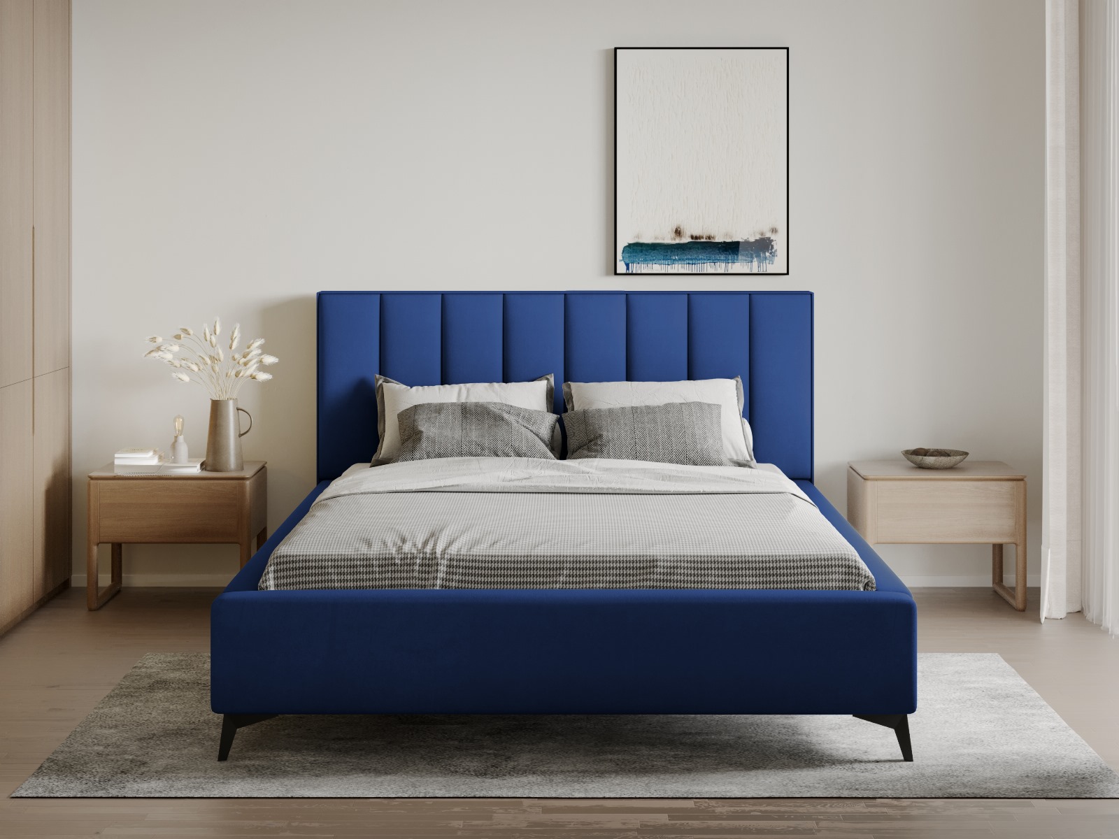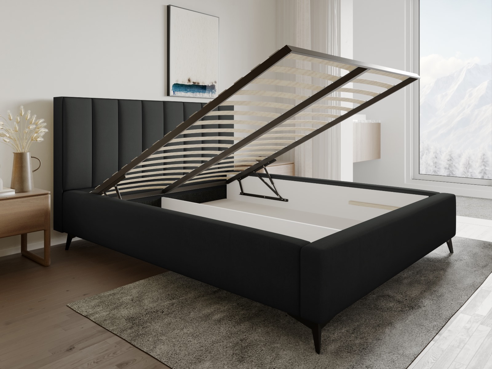 Łóżko Berlin idealnie nadaje się do każdej sypialni, dzięki bardzo wytrzymałemu stelażowi wraz z pojemnikiem na pościel łóżko jest bardzo funkcjonalne, dodatkowe metalowe nóżki dodają stabilizacji oraz pięknego wyglądu. Na aranżacji przedstawione jest łóżko na materac 160x200z metalowym stelażem z gazowym podnośnikiem, stelaż posiada 34 drewniane listwy po 17 na stronę, które są bardzo wytrzymałe dzięki czemu stelaż będzie nam służył długie lata, oraz bardzo przyjemny w dotyku i czyszczeniu materiał welurowy MAGIC VELVET.