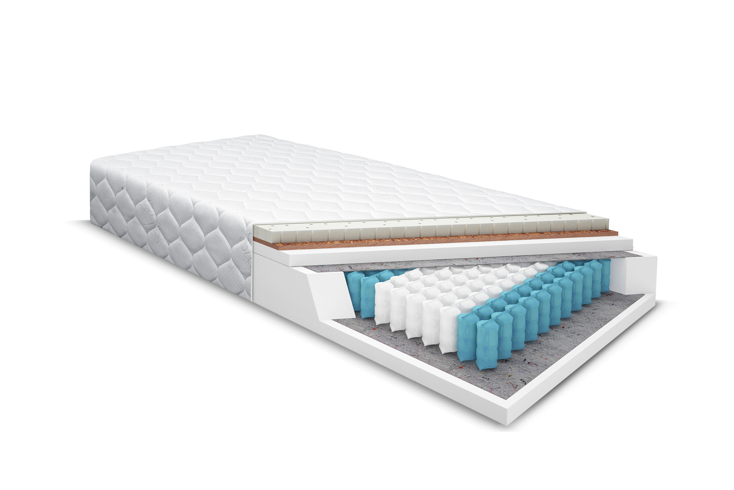 Materac EMILIANO, to dwustronny materac z systemem sprężyn kieszeniowych w ilości 270 szt na m2 . System pocket bonell to sprężyny w kształcie walców umieszczonych w osobnych materiałowych kieszeniach. Zastosowanie systemu kieszeniowego wpływa na właściwe podparcie układu szkieletowego podczas snu. Materace kieszeniowe doceniane są przez osoby borykające się z problemami kręgosłupa, bowiem sprzyjają one zachowaniu właściwej pozycji snu. By materac był jeszcze bardziej komfortowy zastosowano system siedmiu stref twardości, który poprzez zróżnicowany stopień sprężystości doskonale podpiera poszczególne części ciała. Wypełnienie kieszeniowe jest otoczone pianką antyalergiczną posiadającą certyfikat OEKO-TEX oraz atest higieniczny, wspomaga ona właściwą wentylację materaca. W materacu zastosowano filc, który zapewnia jego dłuższą żywotność. Dodatkowo zastosowano matę kokosową, która poprawia cyrkulację powietrza, wchłania wilgoć oraz odprowadza ją na zewnątrz. W materacu wykorzystano płytę pianki lateksowej, która charakteryzuje się wysoką odpornością na odkształcenia oraz wyjątkową elastycznością.