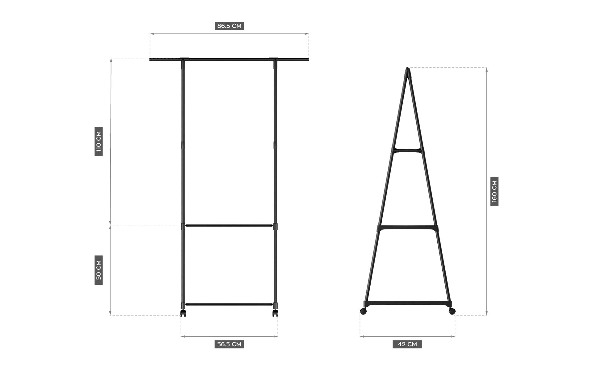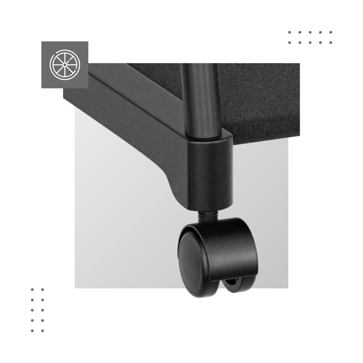 Wieszak jest w pełni mobilny dzięki zastosowaniu praktycznych, nierysujących podłogi kółek. System ten pozwala przesuwać go z miejsca na miejsce bez użycia siły. Kółka w każdej chwili można zablokować, aby uniknąć zbędnego poruszania się wieszaka.