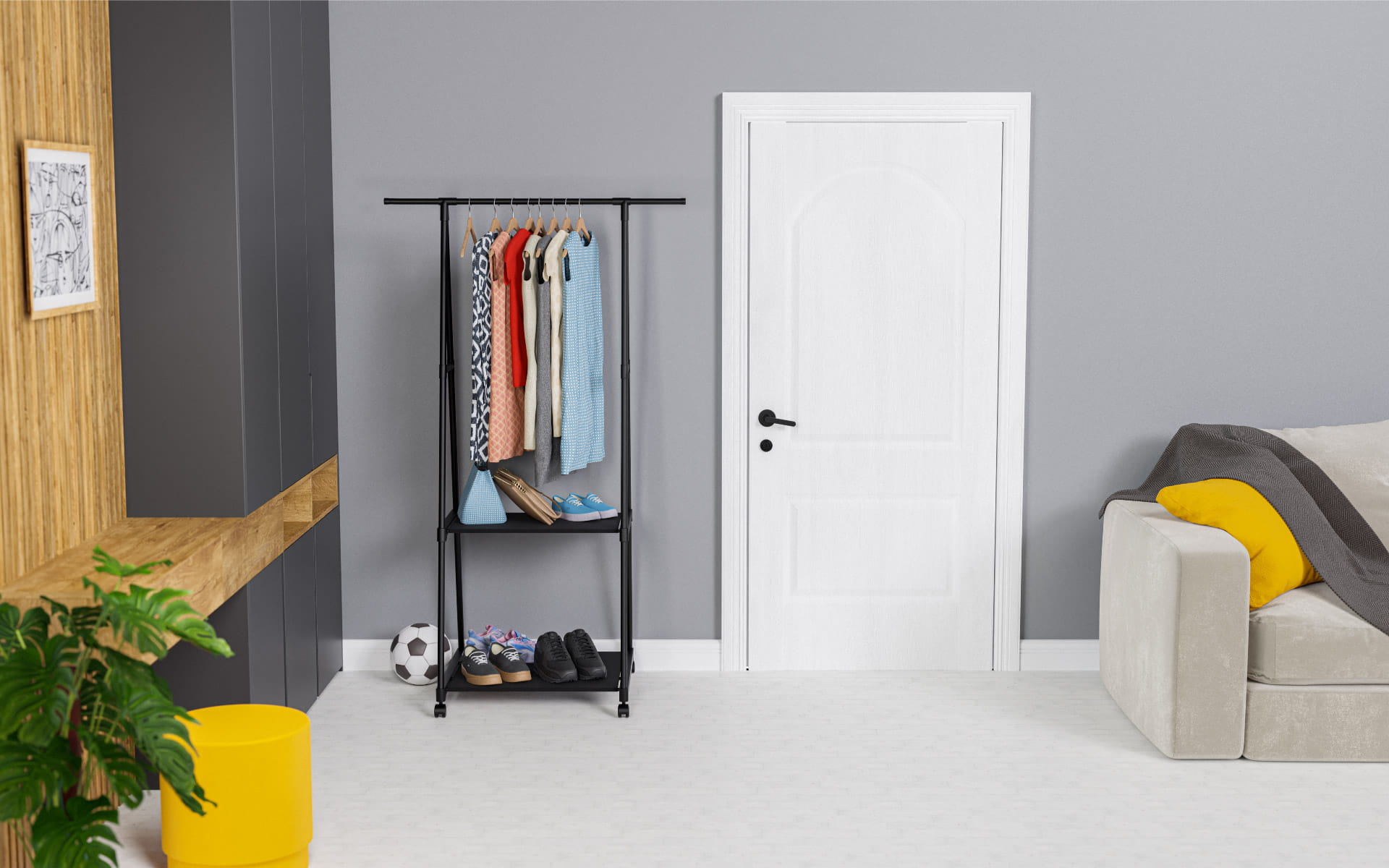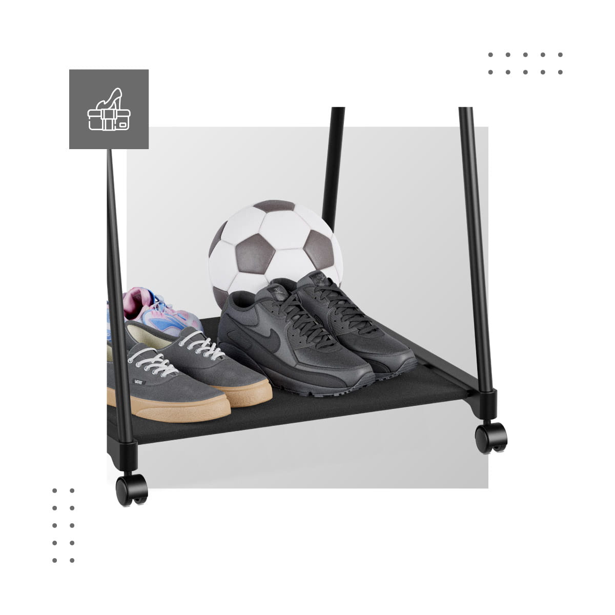 Keeper 1.5 świetnie sprawdzi się jako wyposażenie garderoby, a także mobilna szafa do sypialni. Torebki, sukienki, koszule, garnitury, akcesoria? Wieszak pozwala nie tylko przechowywać, ale też eksponować najładniejsze rzeczy z Twojej szafy. Półki na buty w wieszaku Keeper 1.5