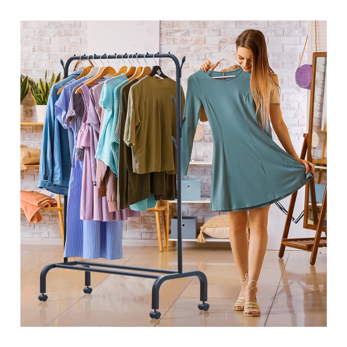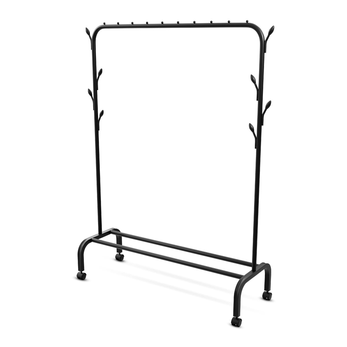 W dolnej części stojaka znajduje się praktyczna przestrzeń na buty lub inne akcesoria. Dzięki Handy 2.2 Twoje ulubione przedmioty zyskają własne miejsce, z dala od brudu i bałaganu. Kółka w wieszaku Mark Adler Handy 2.2